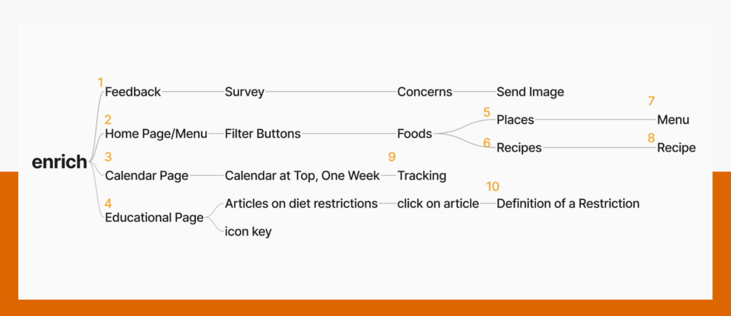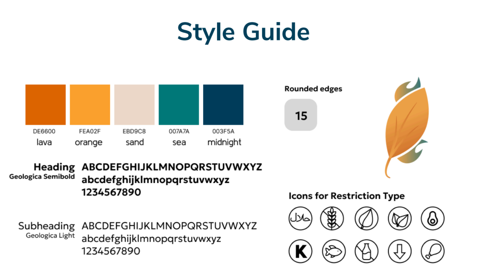 Before starting on wireframes, we established the app’s color palette, typography, and visual elements. We chose a bright orange and teal palette to create a fun, energetic vibe, moving away from the typical “health app” green. The font was selected to feel strong and formal enough for an informational app, while still maintaining a casual, approachable tone for students. The logo incorporated leaf and flame/wind imagery to convey movement and energy, and we designed a set of custom icons representing dietary restrictions, making it easy for users to quickly identify what foods were suitable for them.