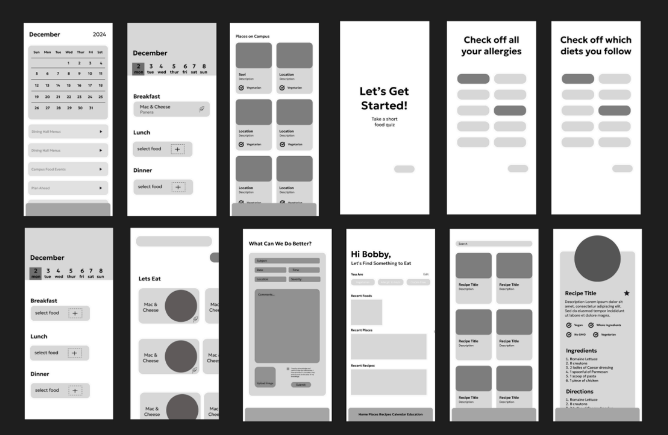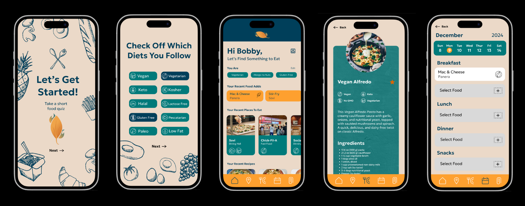 Based on interviews with students who face these challenges, we developed user personas to better understand their needs, behaviors, and pain points. These personas helped guide our design decisions, ensuring the app effectively addressed real student experiences and provided practical solutions for navigating dietary restrictions and food options.
